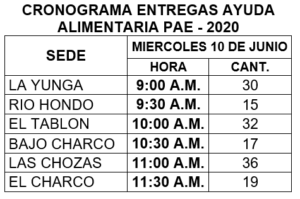 Por favor llegar puntualmente para evitar aglomeración de personas (ni antes, ni después de la hora que le corresponde, de acuerdo al grado de la persona que va a recibir la ayuda). Si se presenta hacinamiento de personas, las autoridades nos suspenderán la entrega.